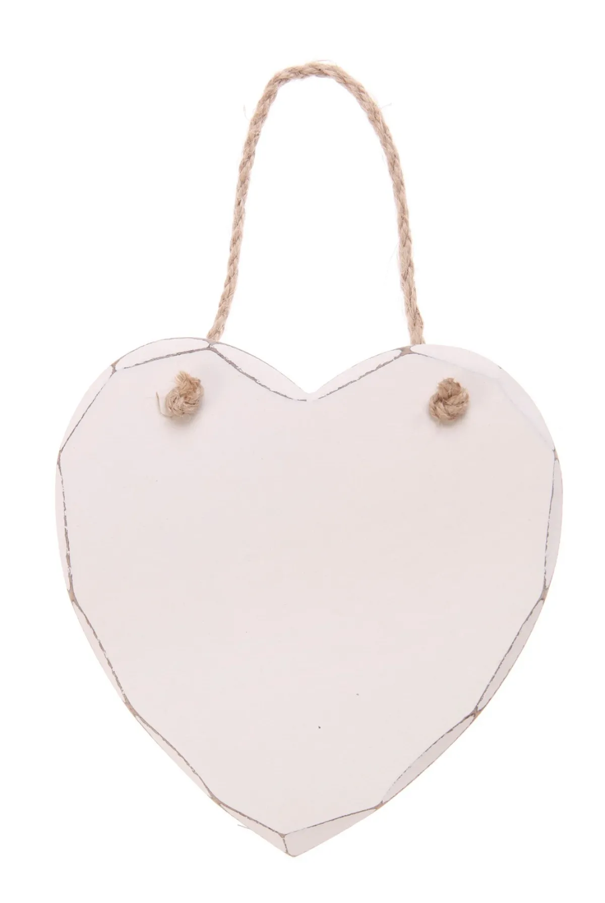 This Wooden Heart Plaque painted ivory white with distressed edges hanging from a jute string is perfect for a hobby project.
