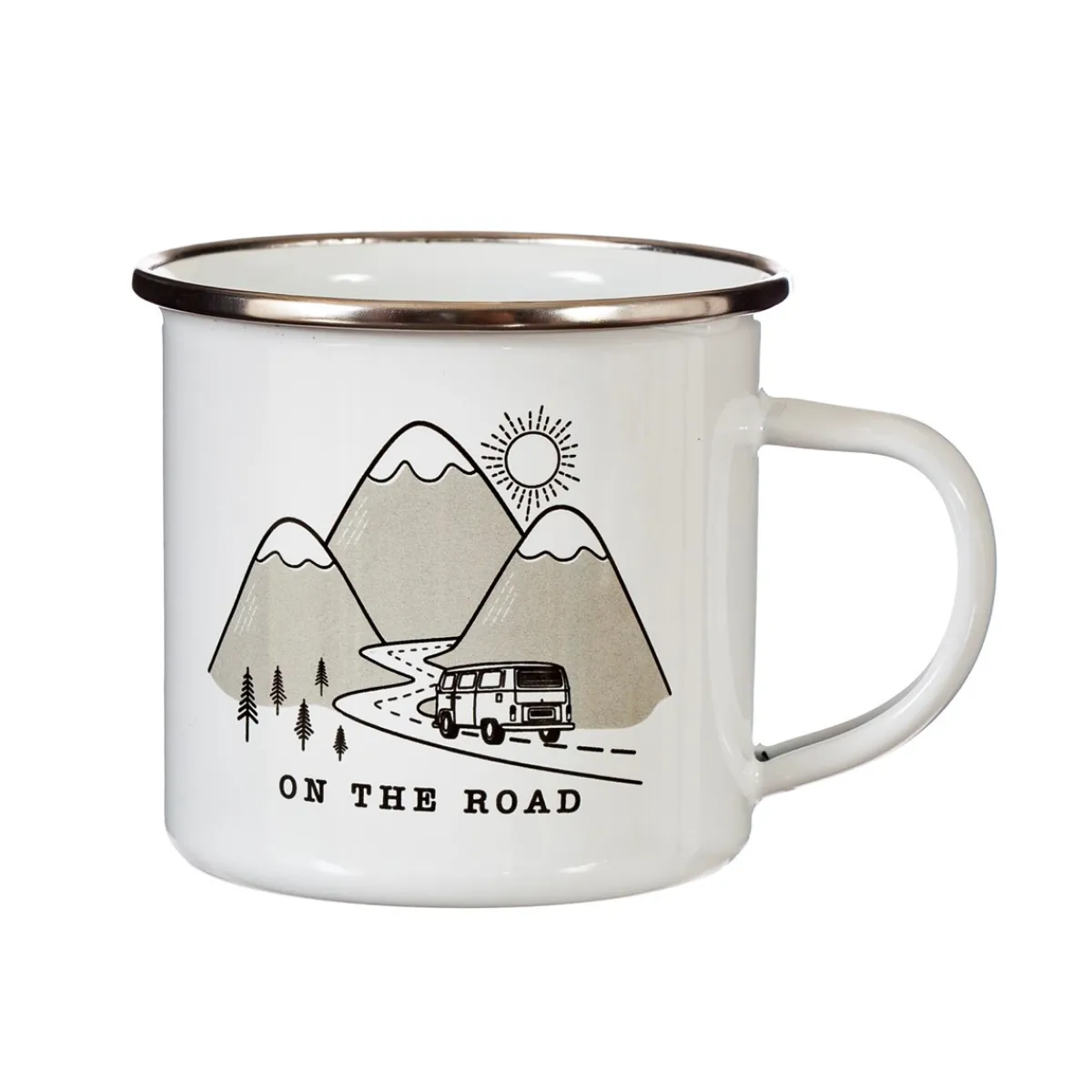 On the road again? This mug makes the perfect gift for your favourite world explorer. Featuring a camper-style shape, this kitchen accessory is adorned with a whimsical mountain illustration in an airy monochrome colourway.