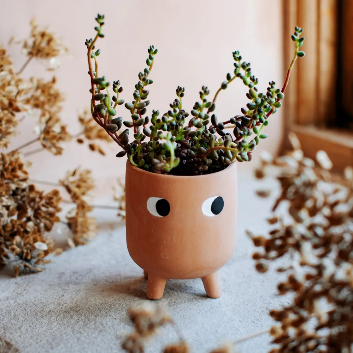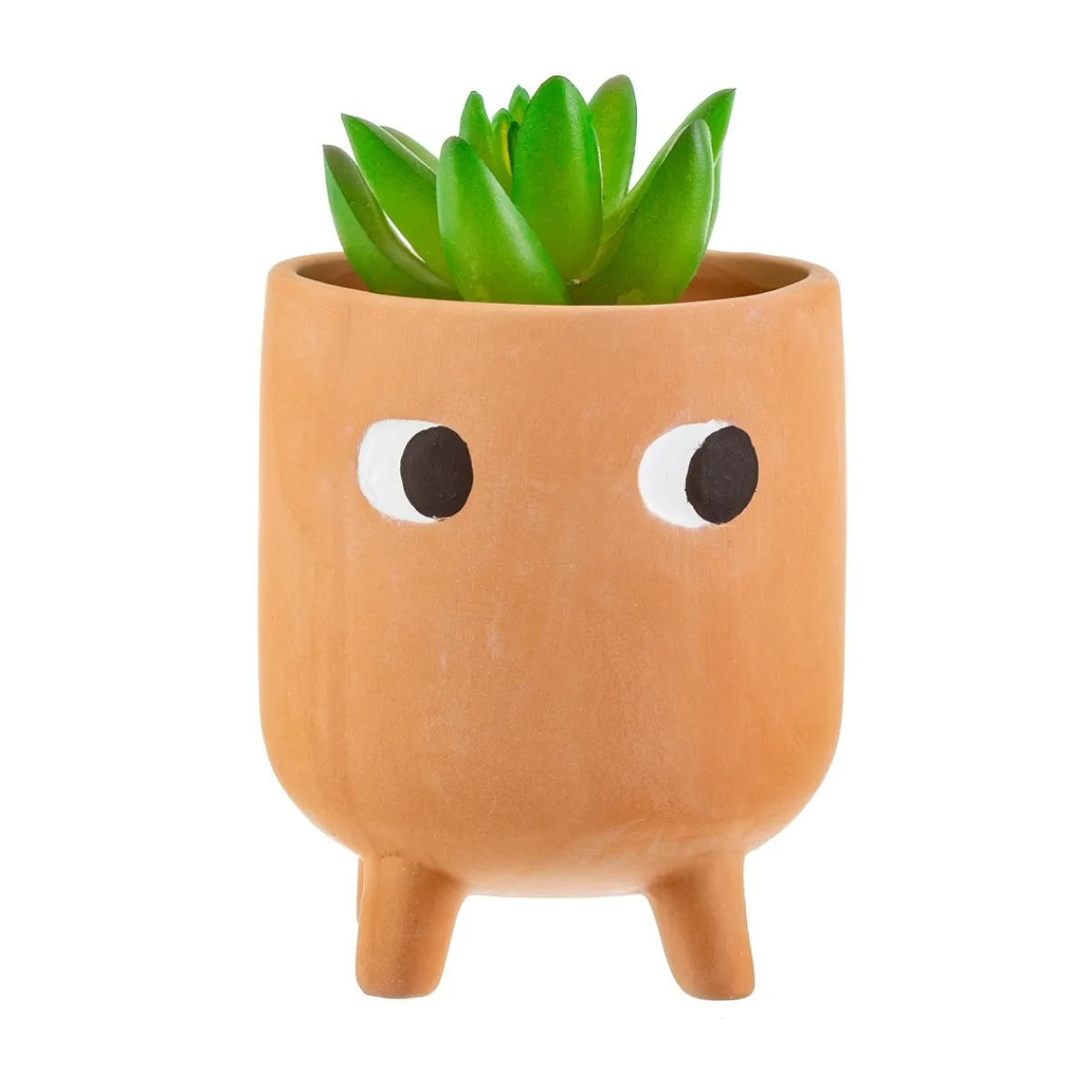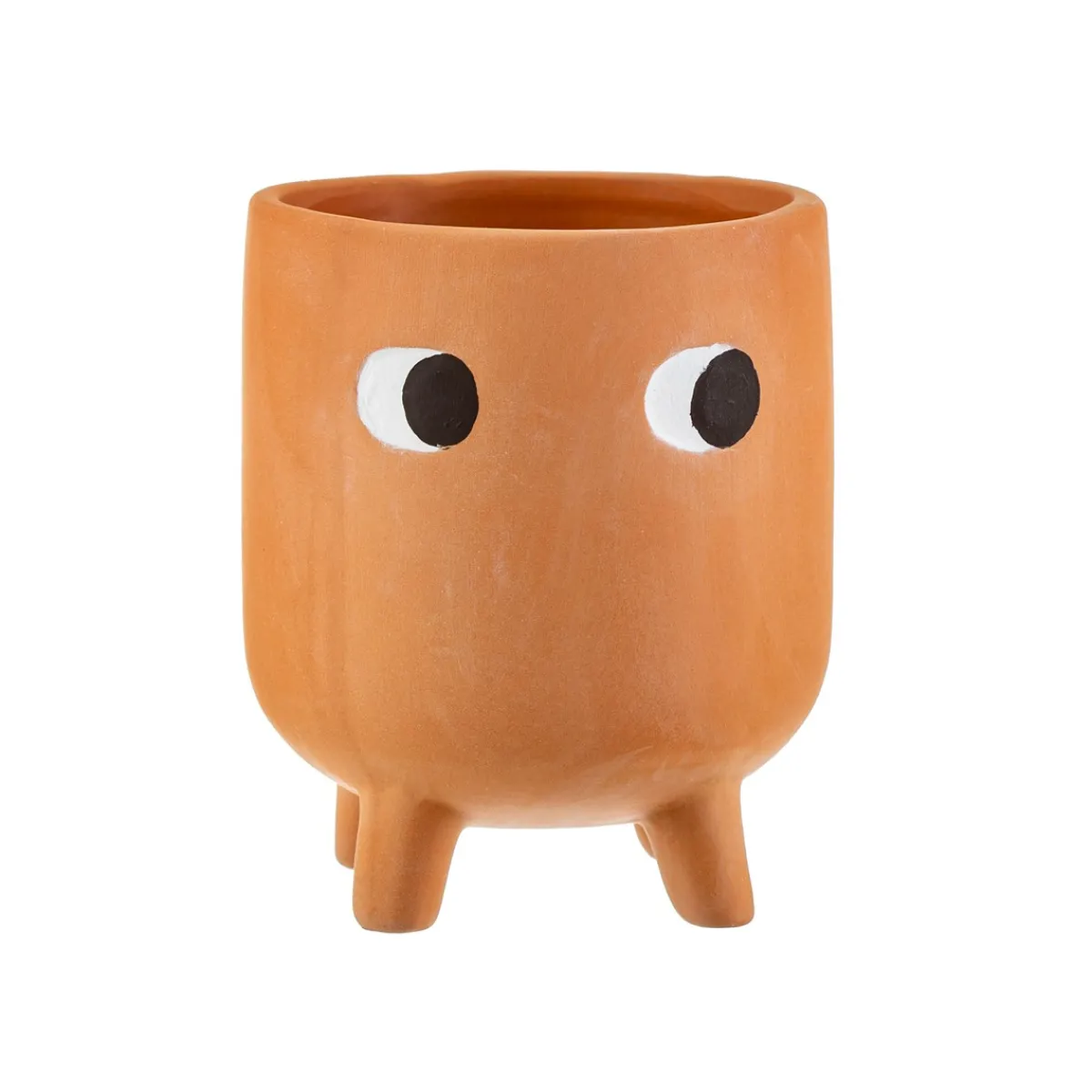 A curiously innocent addition to your plant pal collection. Our little leggy planter features a pair of cute pondering eyes on a bohemian terracotta. Its character and charm are sure to create conversations and inspire a natural mood in your home. This product has been hand-finished with a whitewash to enhance the matte look, causing slight variations between each design.