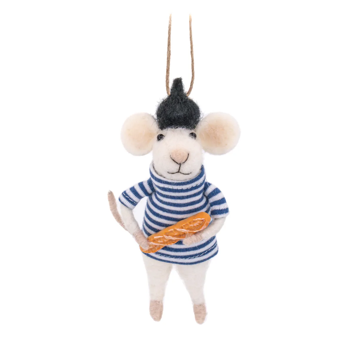 The French Mouse with Baguette Felt Decoration brings a bit of Parisian flair to your holiday decor. With a baguette in hand and dressed in traditional French style, this sweet mouse is perfect for adding charm to your tree.